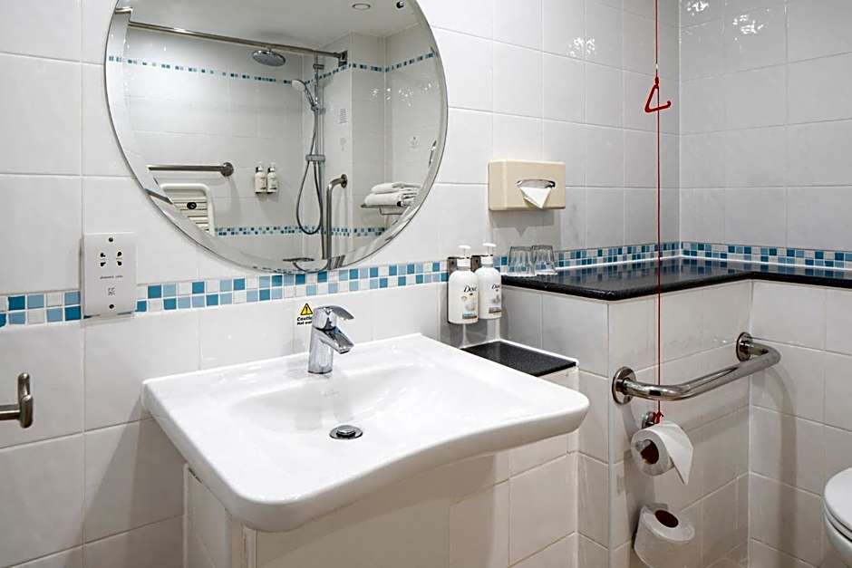 Large, bright room with blackout curtains, tea and coffee making facilities, a work desk, air conditioning and flat-screen TV. Offering an accessible private bathroom with a bath and shower.